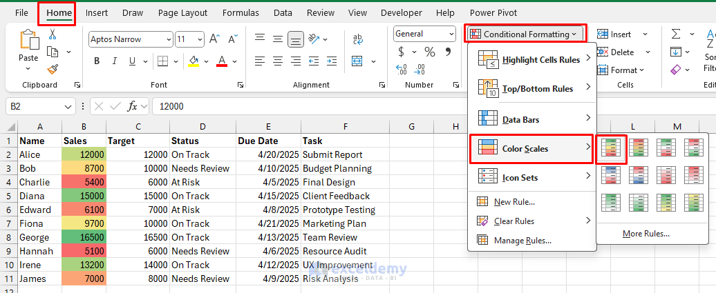- "Apply a color scale to the 'Budget Variance' column to instantly spot major over- or under-spends."